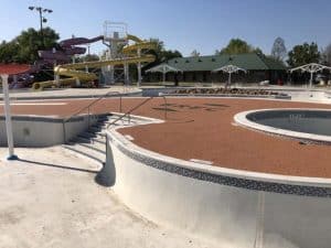 We also provided our No Fault Safety Surface in a tan blend for the “island” that is located in the center of the lazy river pool.   Poured-in-place rubber surfacing is unitary and slip-resistant making it an ideal application for water play areas.  And, our very talented crew installed the BREC Logo in green.