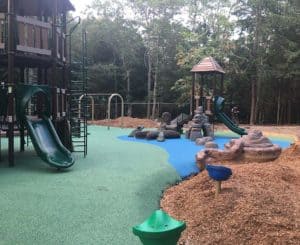 We provided and installed our No Fault Safety Surface in attractive blue and green colors to brighten the look. These colors enhance imaginative play as well providing the feel of transition from land to water. Wilderness lovers are really enjoying this imaginative playground!