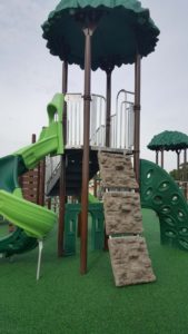 The total project was around 6,200 square feet and featured a bright green poured-in-place surface. Having the full rubber surfacing was an important part of making this playground accessible and welcoming to all the students. The No Fault Safety Surface is perfect for this inclusive playground since it’s slip-resistant, safe, and allows greater accessibility for wheelchairs and other mobility devices. The beautiful green color of the surfacing really complements the play equipment that was chosen. Beauty and safety combine to make a unique and attractive play space!